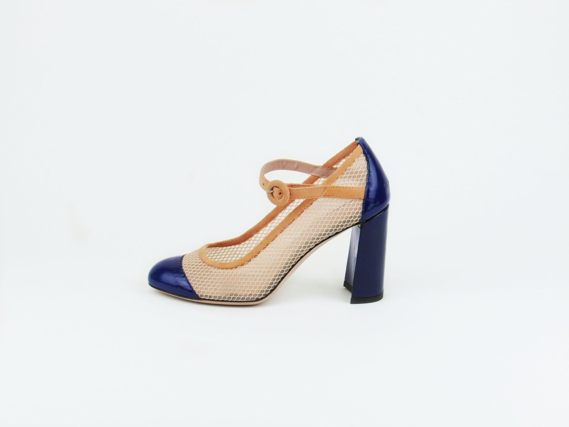 Our classic Mary Jane silhouette with indigo blue patent leather and sherbet suede. They've never met legs they couldn't flatter.