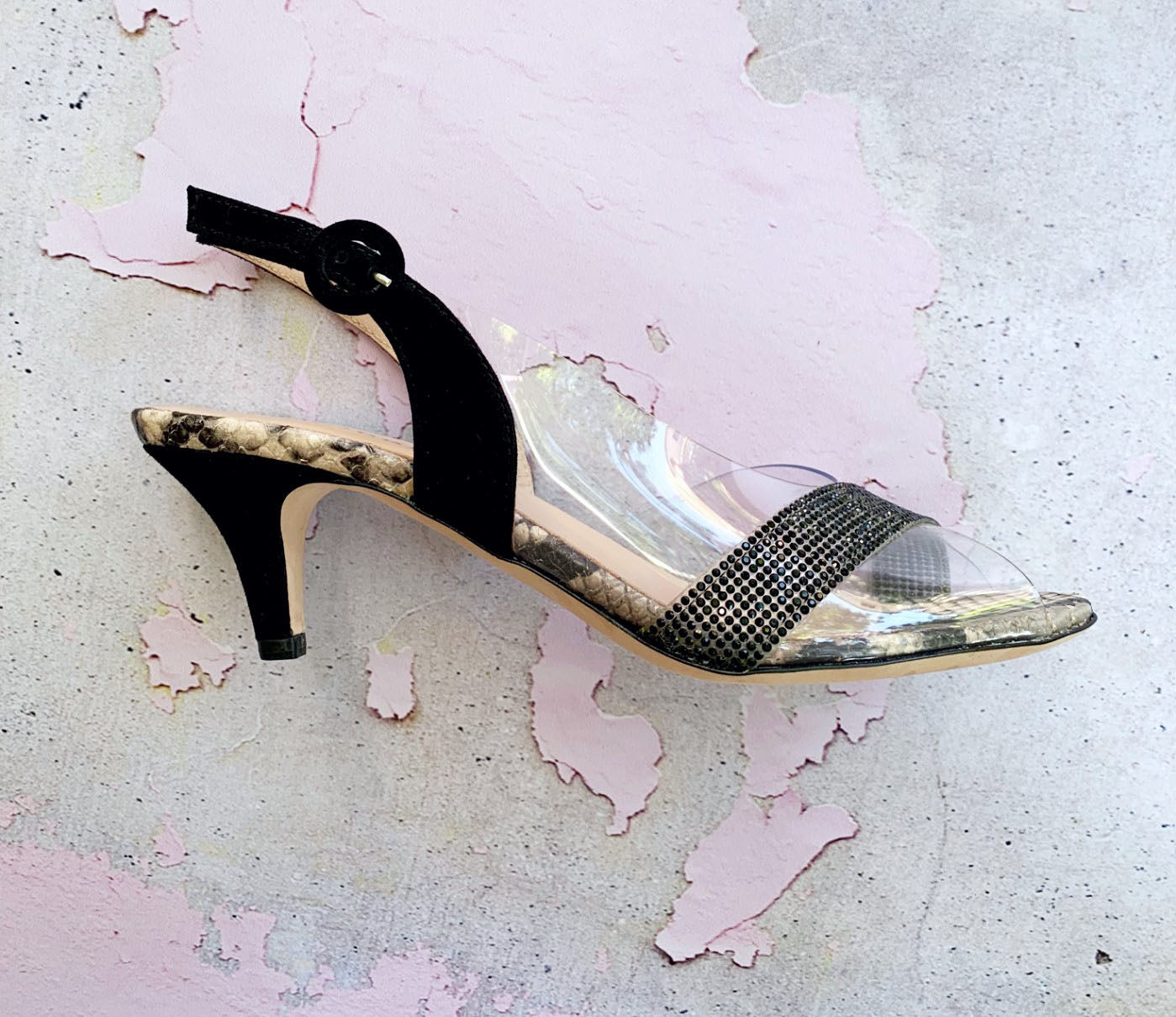 Cinderella at the disco! That's you every time you put on this sparkling jet kitten heel. The Lorelei is feminine, flattering and fabulous. A note about PVC; it can feel stiff and tight when you first put it on but as it warms it stretches and forms to your foot- hang out in them for 3-5 minutes before you decide on their fit and comfort.